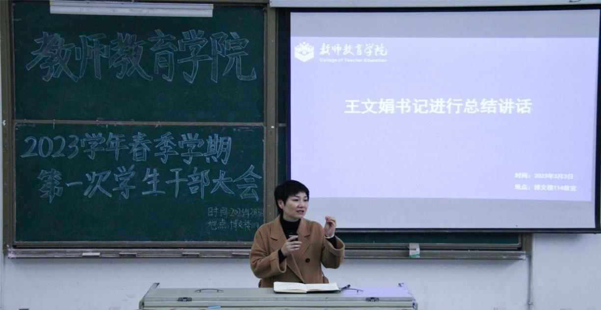 王文娟书记指出,2023年是全面宣传贯彻落实党的二十大精神的开局之年,是“十四五”规划承上启下的关键之年,也是全力决战硕士学位授权单位建设的冲刺之年,希望全院学生干部要保持高度的政治觉悟和坚定的政治立场,增强政治意识、大局意识,用理论武装头脑、指导学习生活工作。王书记强调,新学期伊始,要持续抓好“六大专题”、“四项专项管理工作”,重点做好以下工作:一是重视意识形态教育管理工作,进一步增强学生意识形态教育,引导学生听党话、跟党走,把握政治方向,增强责任意识。二是要高度重视学生生命、心理健康、网络、食品等安全教育。三是要持续强化学风建设,以学促教、以学促改、以学促强。四是积极参与师范专业认证工作,助推小学教育师范专业认证工作顺利通过。